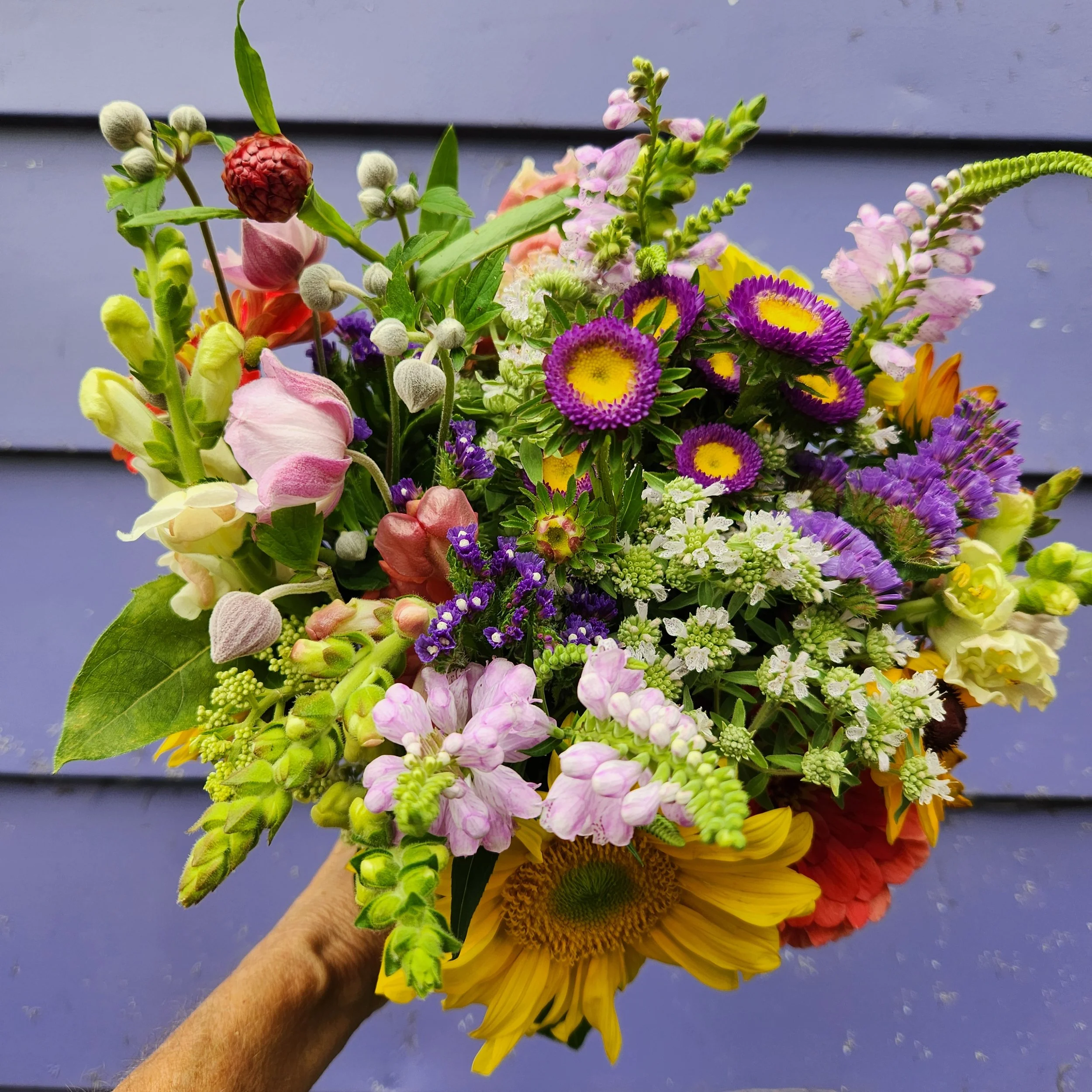 The ten week Summer Season Bouquet Share program covers late spring to late summer and includes all the jewels of the season - Zinnias, Larkspur, Sunflowers, Snaps, Calla lilies, Peonies, Celosia, Rudbeckia, Roses, Statice, Lavatera, Lambada, Rose Lilies, Tuberose, Phlox, Lisianthus, Hydrangea, Dahlias. and many more! We grow over 35 types of annual flowers and many perennials during this period! Ten weeks of bouquets for $250.00 ($25/week) . Remember to select your pick up location when you check out!